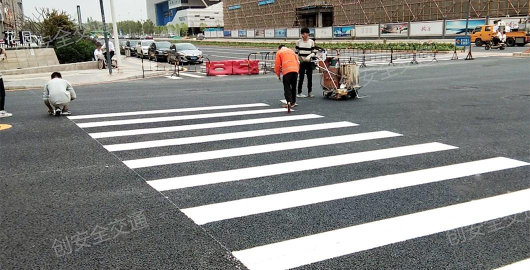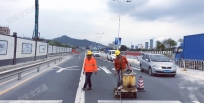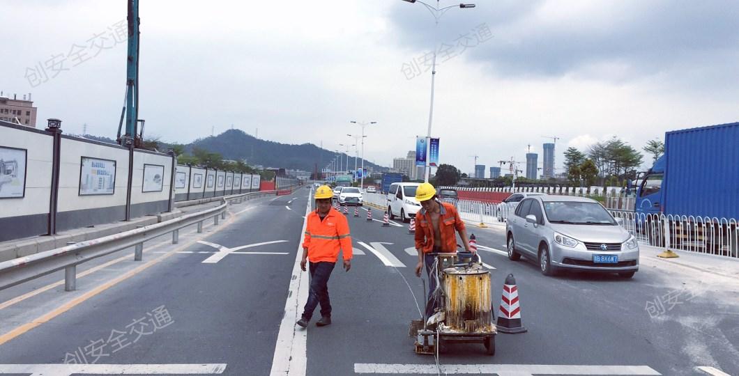 上圖中為創(chuàng)安全施工隊在356省道深圳坪山段的劃線現(xiàn)場施工圖,從圖中能看到,356省道是六車道,路面的交通標線已大部分脫落。現(xiàn)在我們的劃線隊員們正不辭辛苦,努力著修補著地面的交通標線,雖已有人員熱的汗流滿背,衣服扣子都已解開,但是遵循安全第一的他們,依然把反光衣穿在身上。